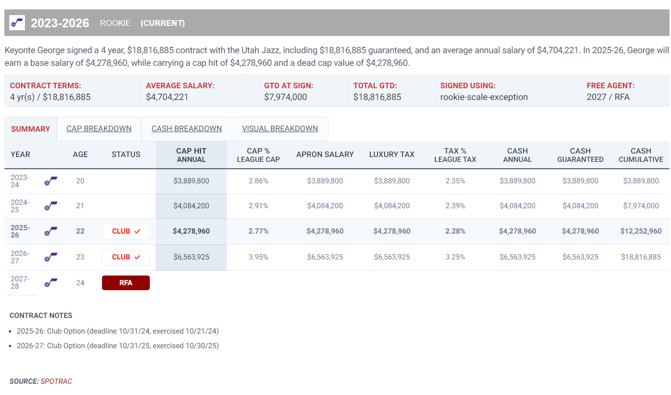 乔治跟文班亚马、阿门同为2023届的新秀,他是首轮16顺位,他在今夏也有资格跟爵士讨论一份五年2.71亿的提前续约顶薪,乔治如果能延续这个表现,甚至达到场均25+7的水准,他今夏说不定真的有希望拿超级顶薪。